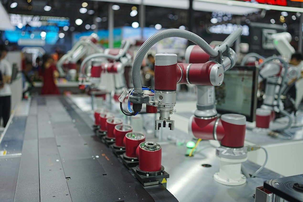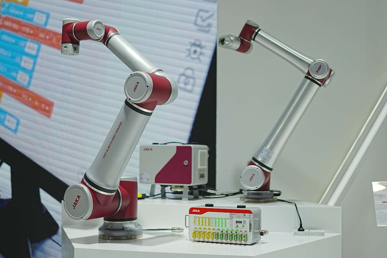 9月23日,第 25 届中国国际工业博览会盛大启幕。开幕式上,两台JAKA Zu20 协作机器人同步创作,以行云流水的沙画表演为为期5天的工业盛典拉开序幕。基于通用智能机器人产品+垂直领域深刻Know-how经验,节卡机器人首发JAKA具身智能家族和AI视觉、大负载新品,并展出多个汽车、电子、精密制造、医疗、教育等行业的创新型应用解决方案。
