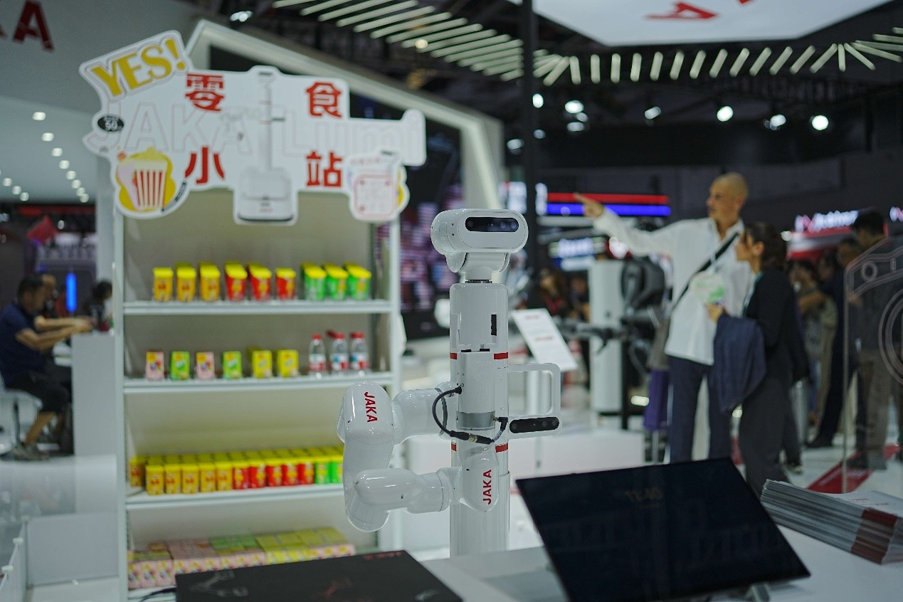 除了传统百变咖啡拉花,集成了语音交互、视觉识别等模块的JAKA Lumi 具身平台,可实现从感知、决策到执行的全程智能规划,可响应人类语音指令自如抓取积木,或在 AI 智慧商超内,自主导航、精准定位,到目标货架定位抓取客户所需商品并送到取餐口供顾客自取。在工博会的智慧养老区,你会看见这台Lumi机器人自如在药架间灵活取用药品的暖心身影。