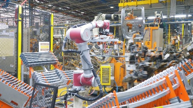 在美国某头部车企的整车制造产线上,40多台节卡机器人对车身、引擎盖 、保险杠、车门等部件执行锁螺丝、涂胶、喷涂、检测等工艺,在提质增效外,其产线实现精益制造、消除“7+1”种浪费,打造智能、绿色、高效的低碳工厂。