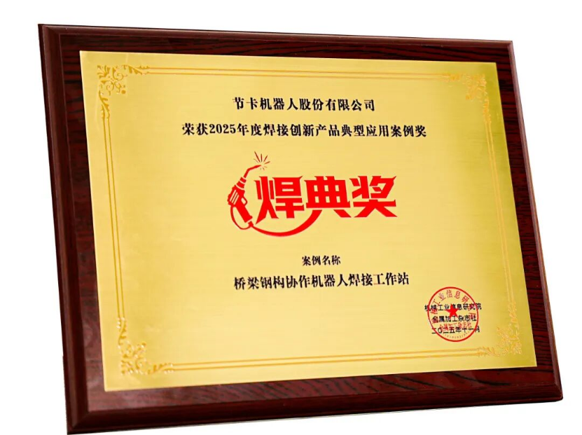近日,节卡机器人凭借其创新的“桥梁钢构件机器人焊接工作站”案例,荣获“焊典奖”——“焊接典范驱动·高效赋能生产”2025焊接创新产品典型应用案例。